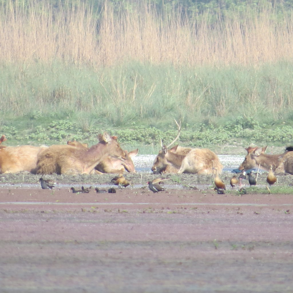 We made our way to the second machan. Here we saw an even bigger herd of swamp deer. I counted 47 of them. Most of the members of the herd were males. Their mighty antlers glistened brightly. Most of members were seated near the grassland. The herd was waiting for the dusk so as to proceed concealed into the jungles to munch the soft grass. This was the largest herd of any deer species ever seen by us. Infact Dudhwa Tiger reserve, particularly Jhadi Tal is the last refuge of Northern Swamp Deer.